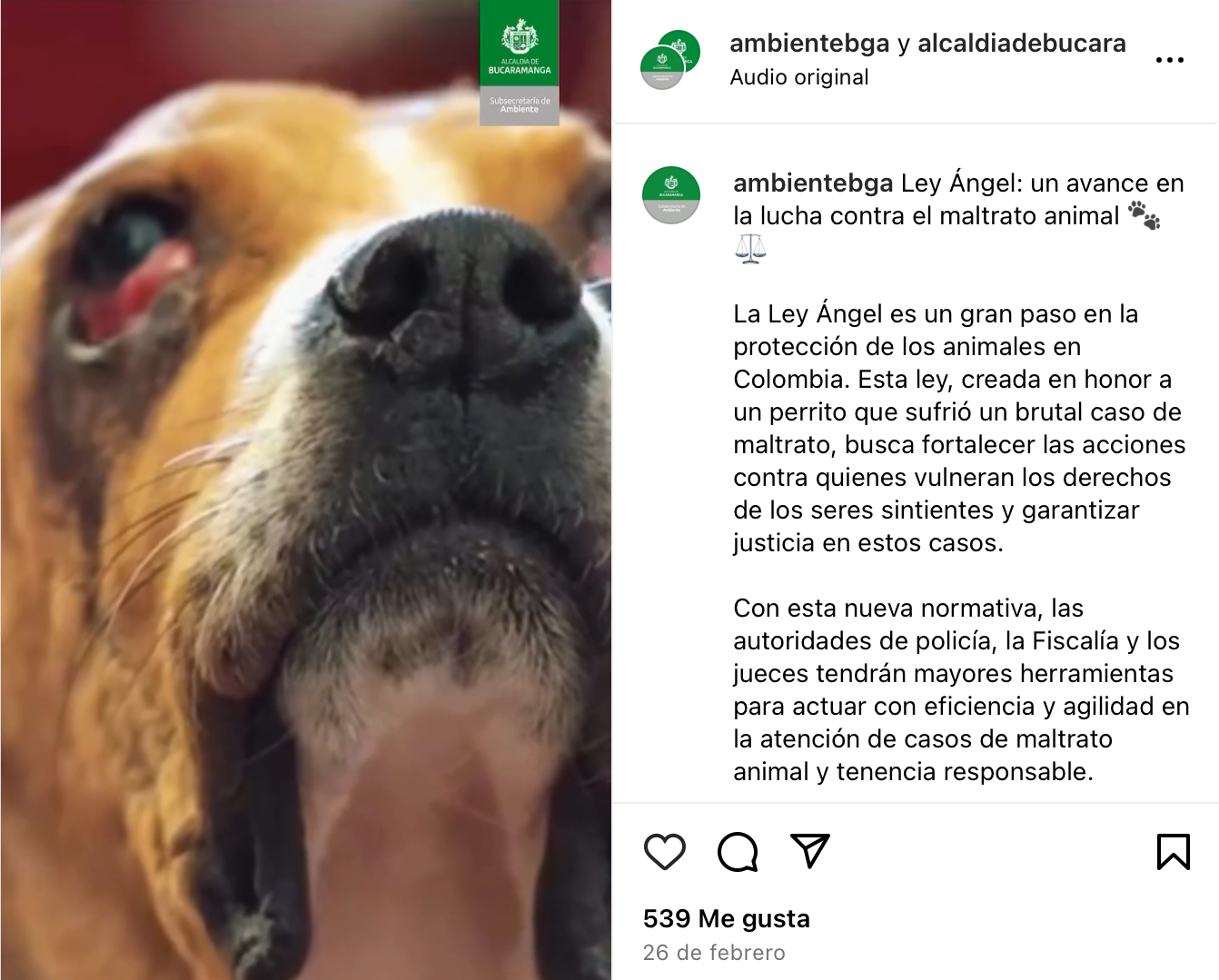 Nieto, V. A. [@vivianieto99]. (2025, 23 de abril). La Ley Ángel ya es ley en Colombia: castiga el maltrato animal con cárcel y multa [Video]. Instagram. https://www.instagram.com/reel/DGj34CPNuz5/
