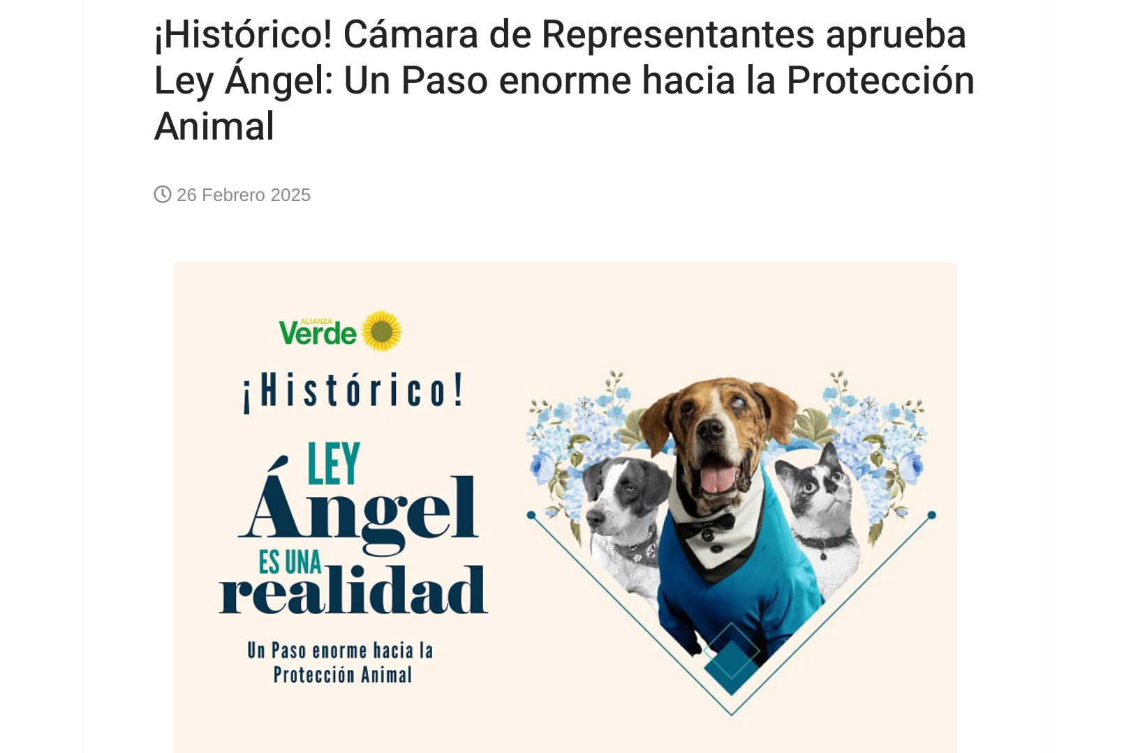 Partido Alianza Verde. (2025, 25 de abril). ¡Histórico! Cámara de Representantes aprueba Ley Ángel: Un paso enorme hacia la protección animal. https://www.alianzaverde.org.co/comunicados/historico-camara-de-representantes-aprueba-ley-angel-un-paso-enorme-hacia-la-proteccion-animal